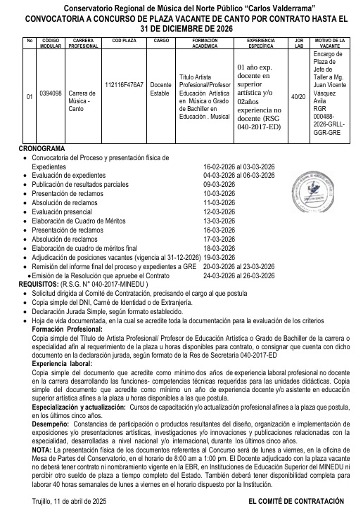 Concurso para cubrir Plaza de CANTO por encargatura de Plaza de Jefe de Taller