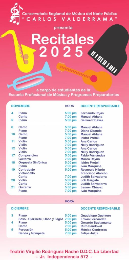 Cronograma de nuestros Recitales, de noviembre y diciembre, que se realizarán en el Teatrín de la DDC – La Libertad
