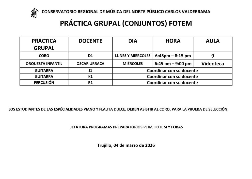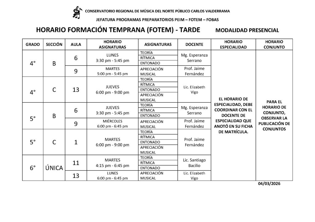 HORARIOS SEMESTRE 2026 – I – PREGRADO – CARRERA PROFESIONAL DE MÚSICA